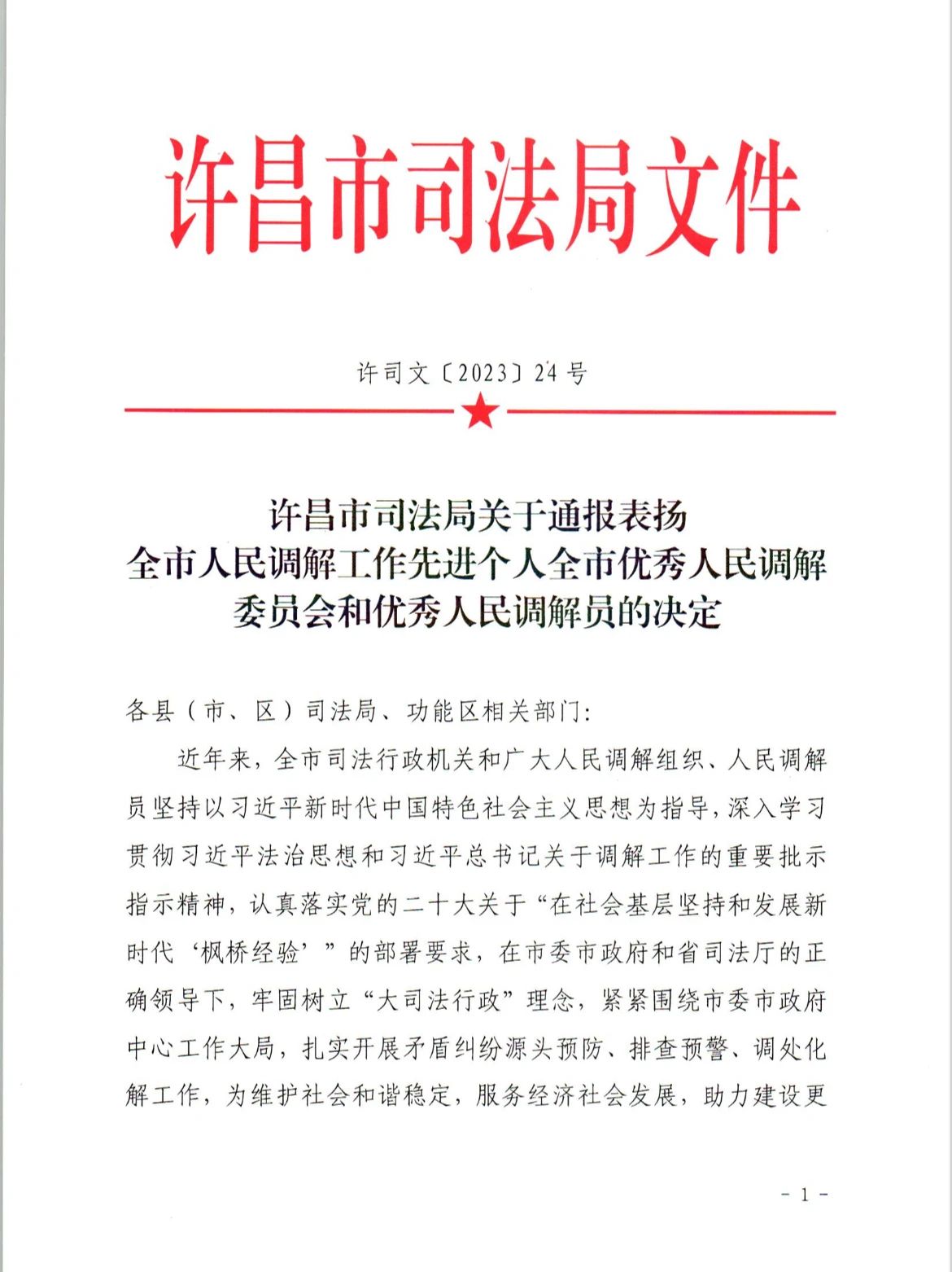 決定指出,近年來(lái),全市司法行政機(jī)關(guān)和廣大人民調(diào)解組織、人民調(diào)解員堅(jiān)持以習(xí)近平新時(shí)代中國(guó)特色社會(huì)主義思想為指導(dǎo),深入學(xué)習(xí)貫徹習(xí)近平法治思想和習(xí)近平總書記關(guān)于調(diào)解工作的重要批示指示精神,認(rèn)真落實(shí)黨的二十大關(guān)于“在社會(huì)基層堅(jiān)持和發(fā)展新時(shí)代‘楓橋經(jīng)驗(yàn)’”的部署要求,在市委市政府和省司法廳的正確領(lǐng)導(dǎo)下,牢固樹立“大司法行政”理念,緊緊圍繞市委市政府中心工作大局,扎實(shí)開展矛盾糾紛源頭預(yù)防、排查預(yù)警、調(diào)處化解工作,為維護(hù)社會(huì)和諧穩(wěn)定,服務(wù)經(jīng)濟(jì)社會(huì)發(fā)展,助力建設(shè)更高水平的平安許昌、法治許昌作出了重要貢獻(xiàn),涌現(xiàn)出一大批人民調(diào)解工作先進(jìn)集體和先進(jìn)個(gè)人。