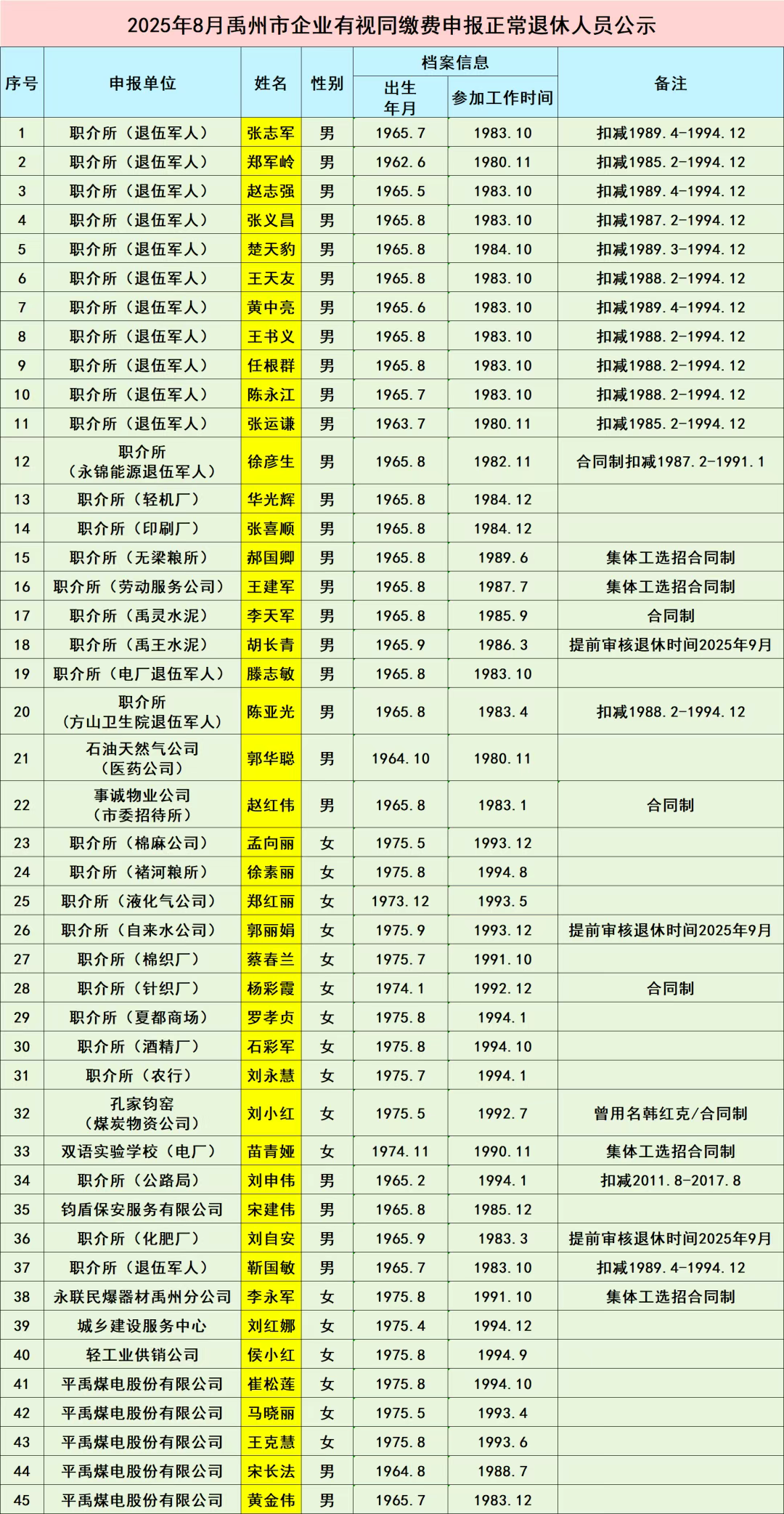 2025年8月禹州市企業有視同繳費正常退休人員公示