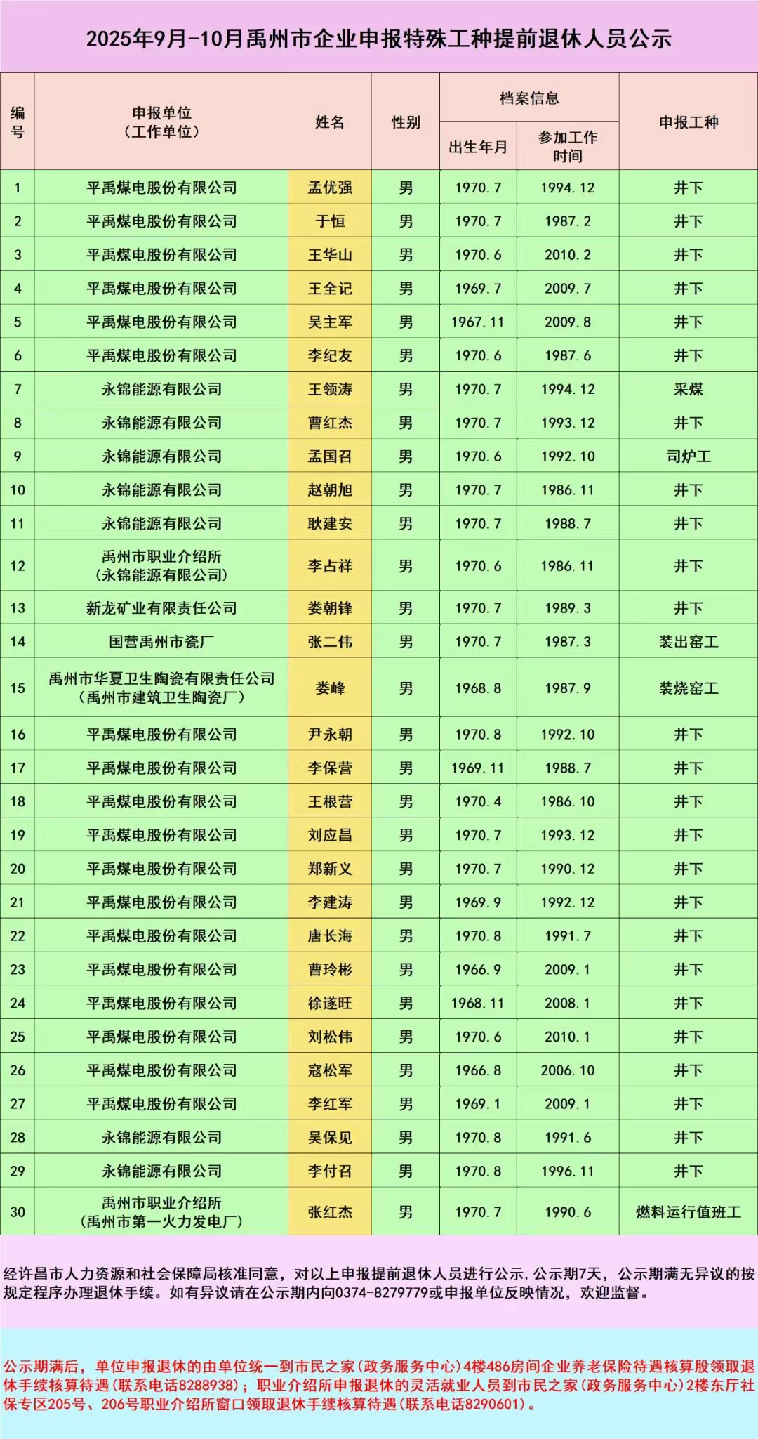 2025年9月-10月禹州市企業申報特殊工種提前退休人員公示