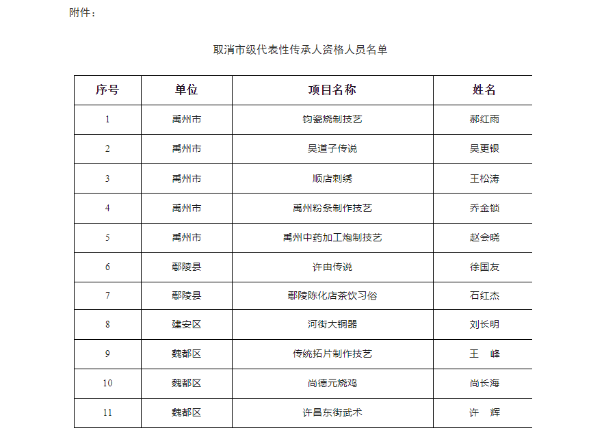 依據(jù)《許昌市市級(jí)非物質(zhì)文化遺產(chǎn)代表性傳承人認(rèn)定管理辦法》、《許昌市非物質(zhì)文化遺產(chǎn)代表性傳承人績效管理評(píng)價(jià)暫行辦法》規(guī)定,決定取消郝紅雨、吳更銀、王松濤、喬金鎖、徐國友、石紅杰、劉長明、王峰、尚長海、許輝、趙會(huì)曉等11人市級(jí)代表性傳承人資格。