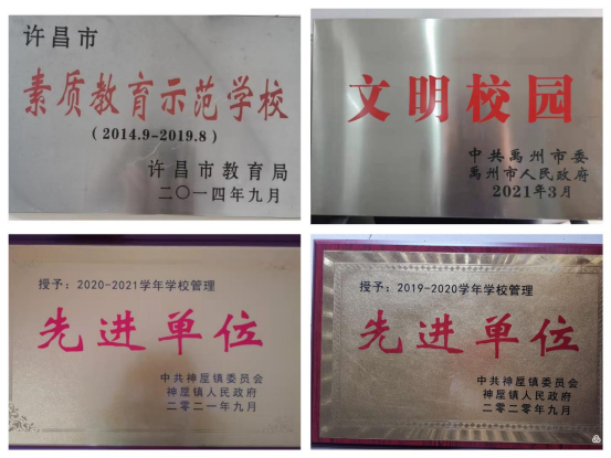 我校也于2014年9月獲得許昌市素質(zhì)教育示范學(xué)校榮譽(yù)稱(chēng)號(hào)、2021年3月獲得禹州市文明校園榮譽(yù)稱(chēng)號(hào)、連年獲得神垕鎮(zhèn)教育總支頒發(fā)的先進(jìn)單位榮譽(yù)稱(chēng)號(hào)。